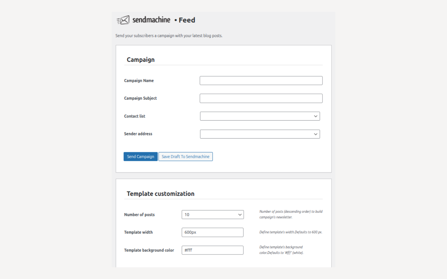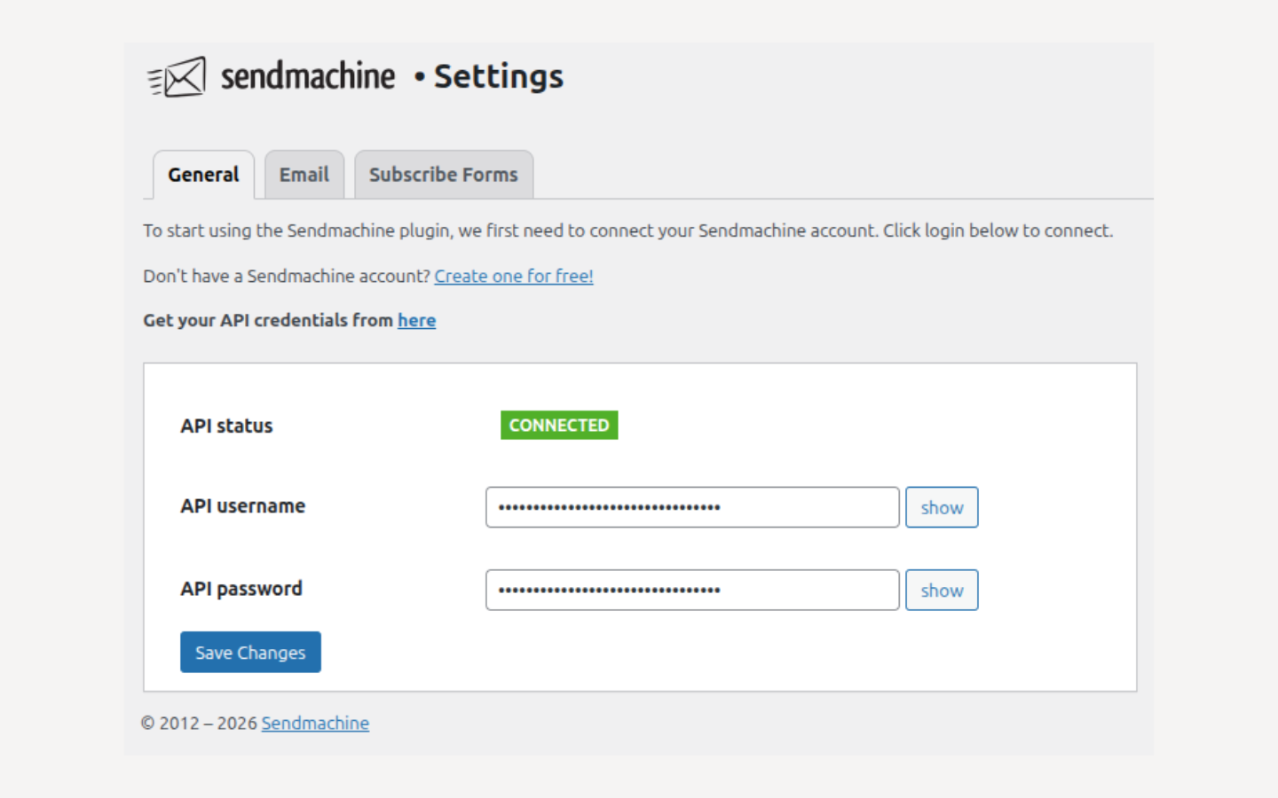 4. Set your Sendmachine API username and password in the plugin’s general settings tab.