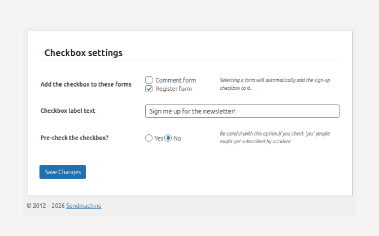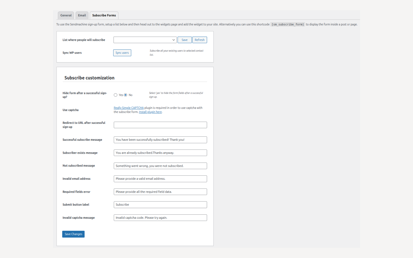 You can set up a signup form in a few easy steps: connect using the provided API credentials, select a contact list where your visitors will subscribe and you’re basically good to go. The signup form is available as a widget (in your widget area) or as a shortlink by pasting [sm_subscribe_form] in a post or page.