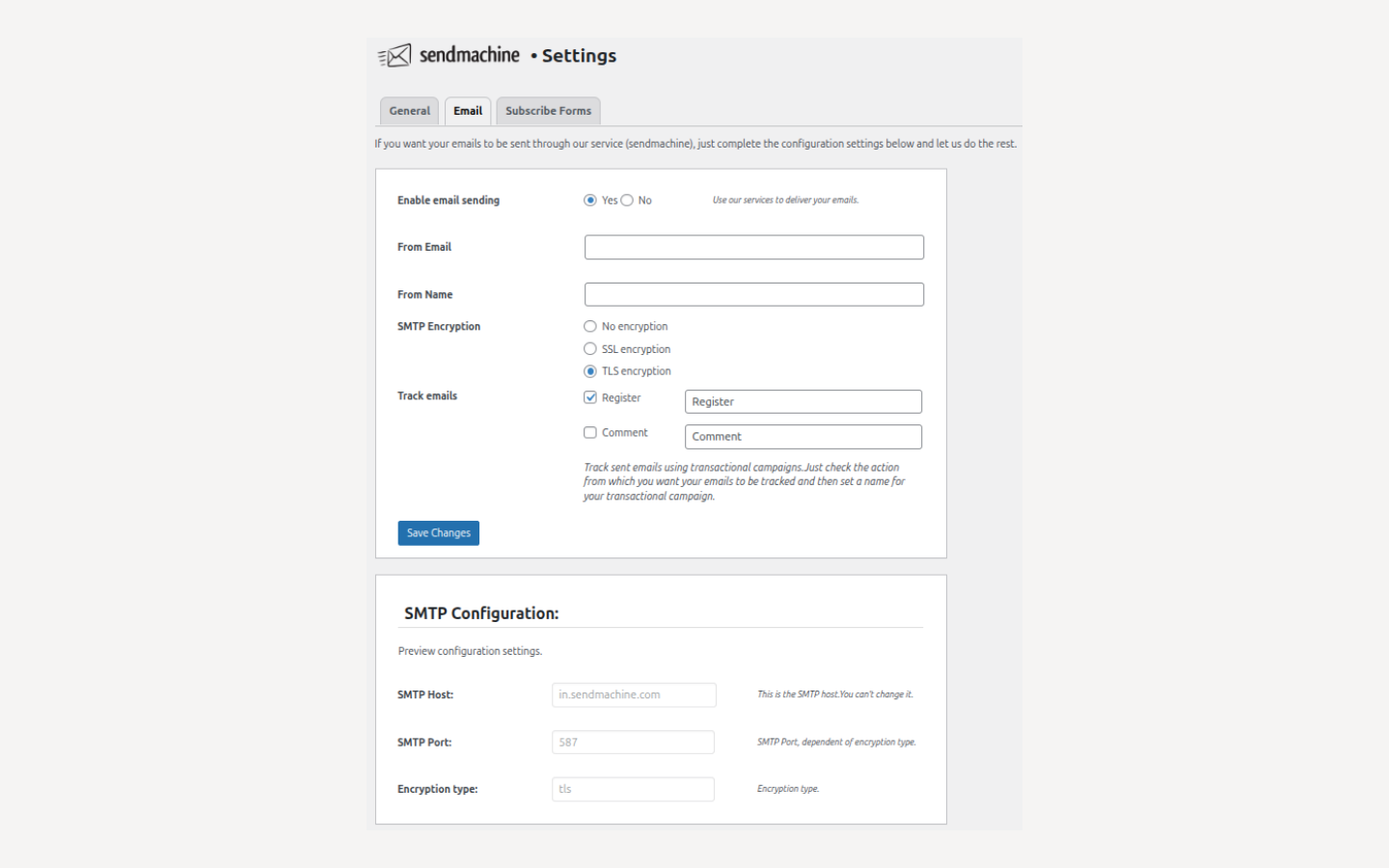 When the email sending service is enabled and configured, all outgoing emails from your WordPress site are routed through Sendmachine’s SMTP servers. This includes core WordPress emails such as password resets, new user registrations, and comment notifications, as well as any emails sent by other plugins or themes.